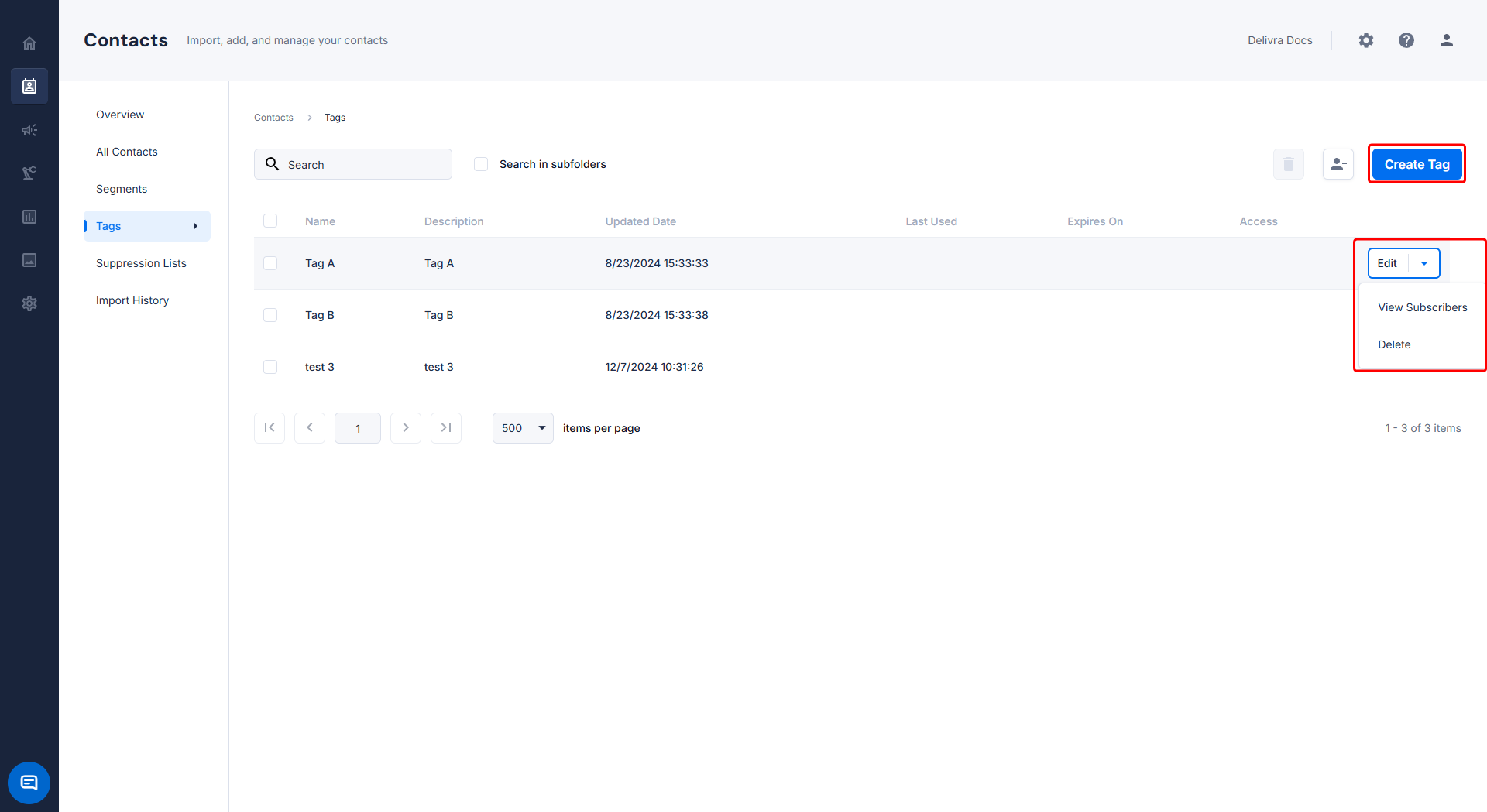 Tags are located in your Contacts dashboard. Your library provides a listing of the tags that you have historically created. Here you can add new tags, edit or delete existing tags, and even view subscribers with a specific tag applied.