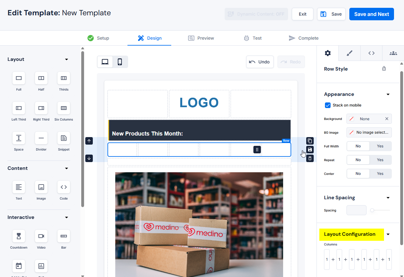 - You can customize the columns for Six Column layouts. Click the row to display the Row Style editor and find Layout Configuration: