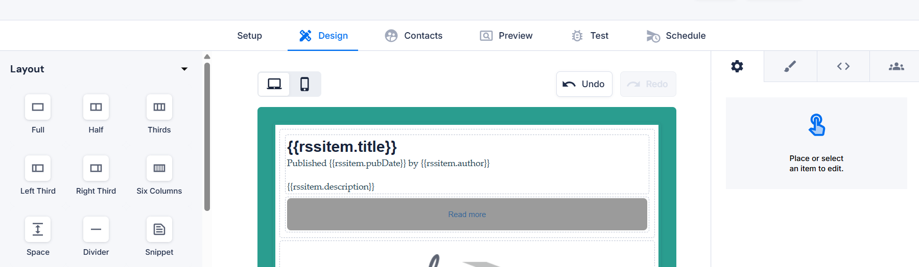 When you reach the Design step, you will notice that a layout row has already been inserted into your template. If you selected a pre built template, the row will be added automatically to the top of your design. This layout row comes pre-populated with a standard RSS layout, but you have the ability to fully define and modify the row to fit your needs.