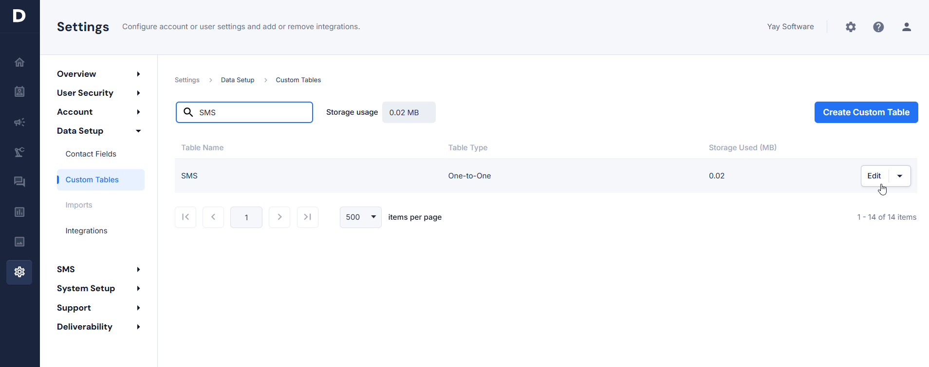 The SMS contact record has 45 fields that you can use to store information for your imported SMS subscribers. To access & customize these fields, go to Settings > Data Setup > Custom Tables. On the Custom Tables page, search for SMS. Click the Edit button.