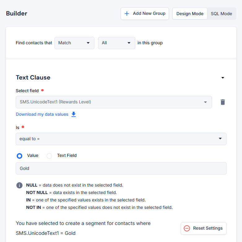 Our first example uses information imported for SMS contact records and a customized SMS field, Rewards Level.