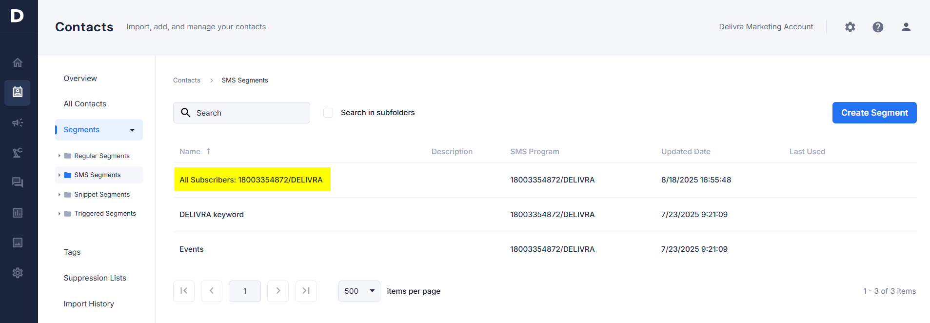 No work on your part necessary on this one! Our system creates a segment for all subscribers per each keyword for you. On the Segment page, click open the SMS Segments folder (left) and look for segment names that begin with All Subscribers.