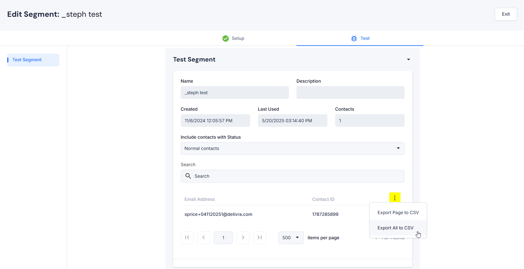 Delivra offers a helpful test feature that allows you to preview which contacts belong to a specific tag or segment. This is especially useful when validating your segmentation logic or confirming contact counts before launching a campaign.