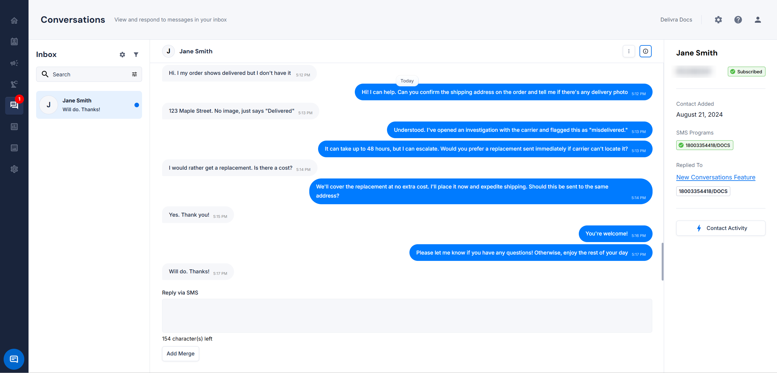 Think of Conversations as a text message inbox for your business. Whenever a customer sends a text that isn’t tied to a keyword like STOP or JOIN, a new conversation begins in Delivra. From there, you can respond just like you would in any text thread.