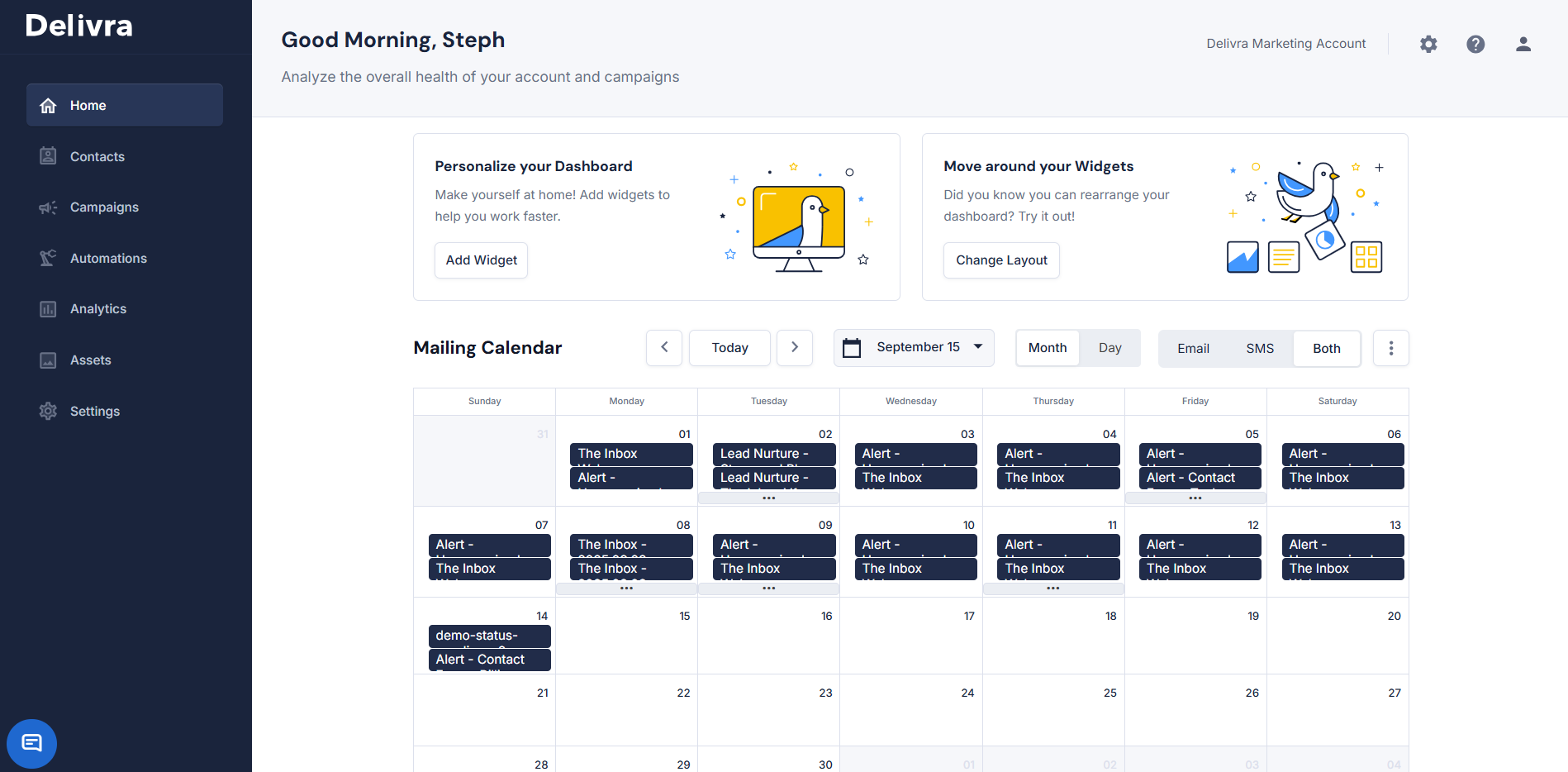 Keep tabs on campaigns that have been sent and those that are scheduled to send with the Mailing Calendar widget. Add it to your homepage dashboard to quickly display your account's campaign activities.